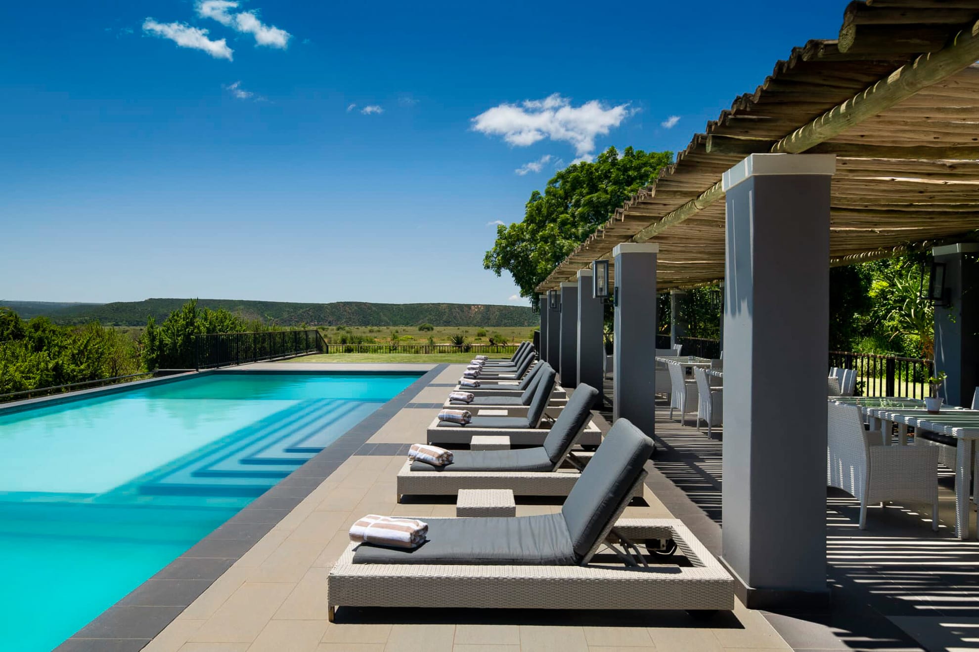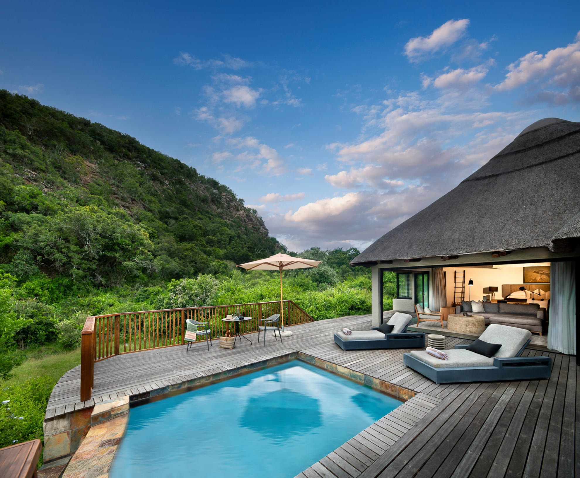 - Sindile Luxury Tented Lodge: ubicado en la cima de una colina con vistas al río Bushman’s, rinde tributo a una legendaria leoparda de la reserva. Sus nueve tiendas de lujo cuentan con piscinas climatizadas y un diseño que fusiona lonas, cuero y texturas de ratán.